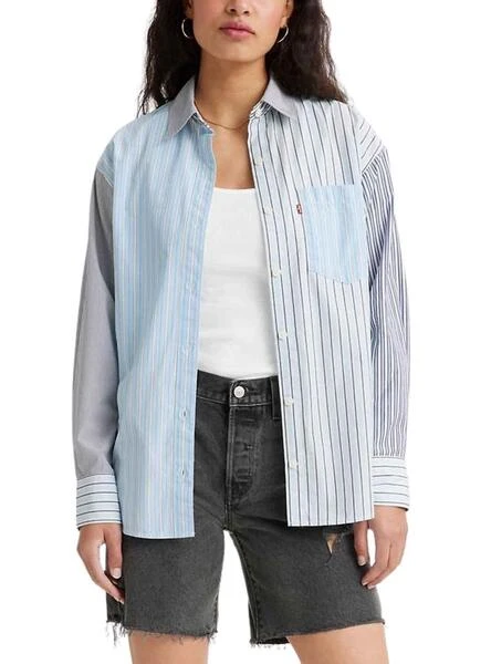 Chemise Levis. Couleur bleu. Listes Printed. Avec des blocs de couleurs. Coupe supplémentairegrand. Poche sur la poitrine. Manche longue. Fermeture avant avec boutons. Etiquette rouge sur la poche. Le mannequin porte la taille S.