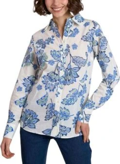 Chemise Naf Naf. Manches longues. Couleur beige. Fermeture boutonnée sur le devant. Imprimé de grandes fleurs. Le modèle porte la taille 36.