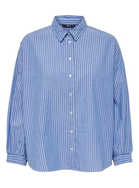 Chemise Only. Modèle Larja. Couleur bleu. Imprimé à rayures verticales. Fermeture boutonnée. Coupe ample. Extrémités des manches élastiques. Épaule tombante.
