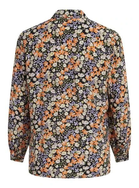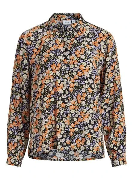 Chemise Vila. Modèle Kikki Béa. Imprimé fleuri sur fond noir. Fermeture avant avec boutons. Poignets boutonnés.
