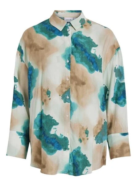 Chemise Vila. Modèle Shiam. Couleur beige. Manches longues. Col de chemise. Fermeture boutonnĂ©e. ImprimĂ© sur l’ensemble du vĂŞtement. Coupe rĂ©gulière.