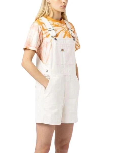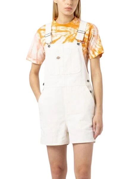 Salopette Dickies. Modèle en toile de canevas. Couleur blanche. Tissu résistant. Coupe droite. Grande poche sur la poitrine. Taille ajustable. Bretelles croisées dans le dos. Bretelles réglables et amovibles. Le mannequin porte la taille S.