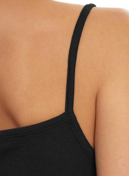 Maillot Tommy Jeans. Modèle Badge Rib Strap. Couleur noire. Bretelles fines. Logo sur la poitrine. Ajusté au corps. Tissu en tricot de coton extensible. Style ajusté. Le mannequin porte la taille S. Coupe skinny.