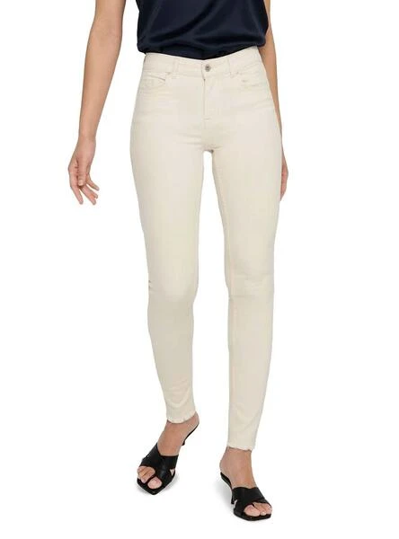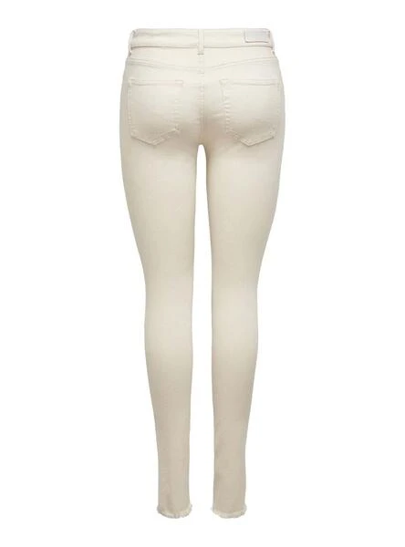 Jeans Only. Modèle Blush Life. Couleur beige clair. Fermeture boutonnée et zippée. Poches latérales et arrière. Coupe Skinny. Tissu extensible. Le mannequin porte une taille S32.