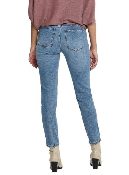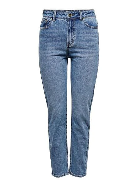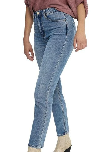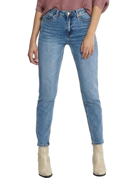 Jeans Only. Modèle Emily. Taille haute. Tissu élastique. 5 poches. Fermeture avant avec bouton et fermeture éclair. Le mannequin porte une taille 28/32.