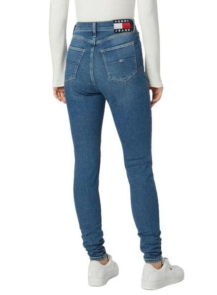 Jeans Tommy Jeans. Modèle Mélanie. Super Skinny. Couleur bleu moyen. Tissu jean. Passants de ceinture. Cinq poches. Écusson logo au dos.