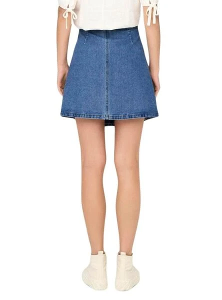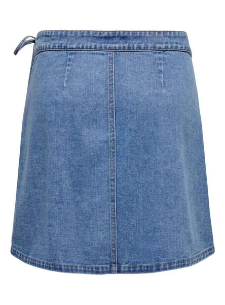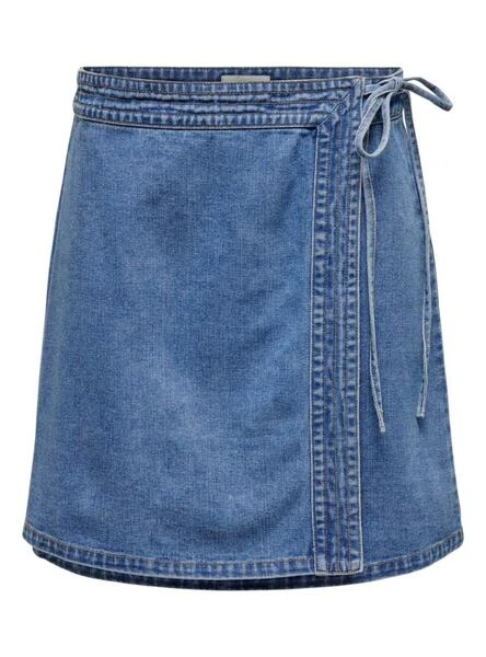Jupe Only. Modèle Villa. Denim moyen. Fermeture croisée avec nœud. Coupe mini. Ajustement régulier.