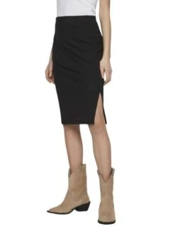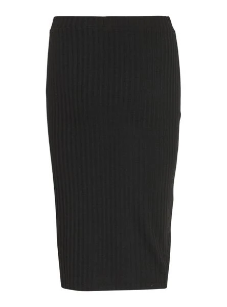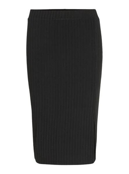 Jupe Midi tube Vila. Modèle Viribini. Couleur noir. Ouverture latérale. Taille haute. Coupe régulière. Tissu doux et élastique. Le mannequin porte la taille M.