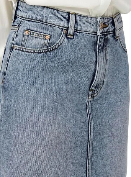 Jupe Only. Modèle Ayoe. Couleur bleue. 5 poches. Fermeture boutonnée. Braguette à glissière. Patch à l’arrière. Ouverture à l’avant.