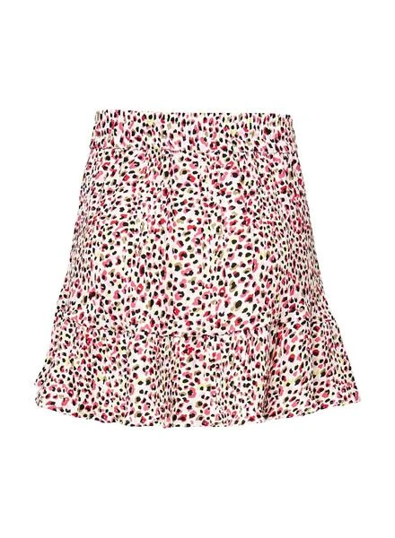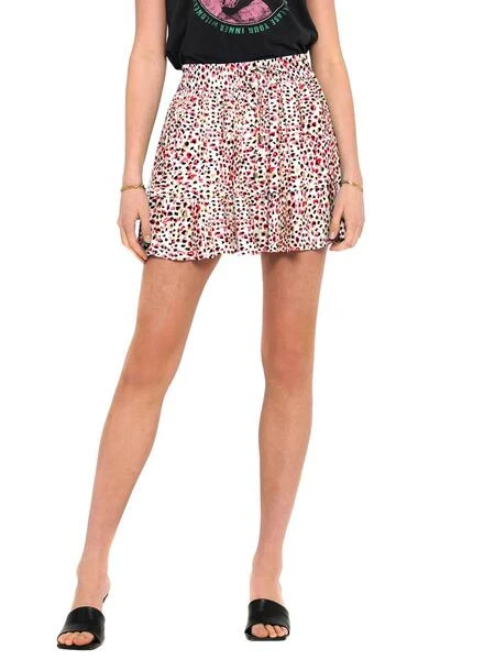 Jupe Only. Modèle Dia Life Plisse. Imprimé à pois. Couleur blanc, rouge, noir et jaune. Taille élastique. Avec volants. Fermeture à lacets. Le mannequin porte une taille S.