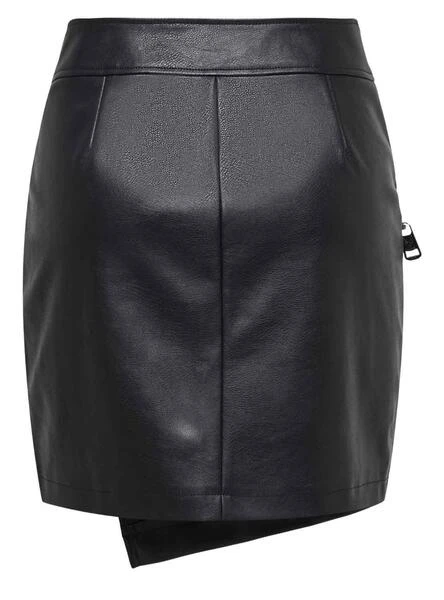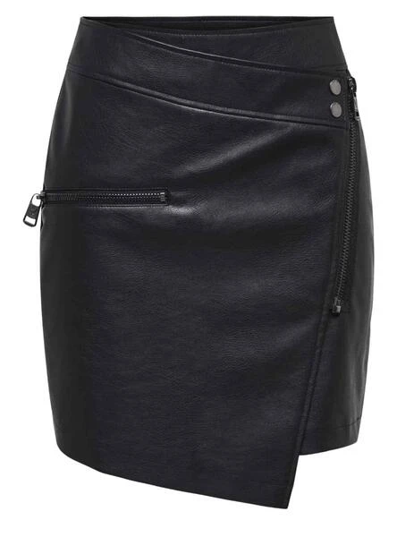 Jupe simili cuir Only. Couleur noir. Style croisé. Plusieurs fermetures éclair.