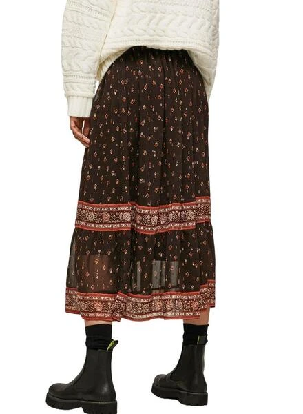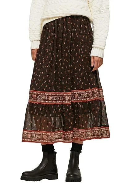 Jupe Pepe Jeans. Modèle Farala. style ethnique. Couleur marron. Printed avec fleurs et chantournage. longueur midi Taille elastique. Doublure intérieure. Tissu mousseline.
