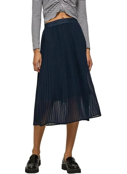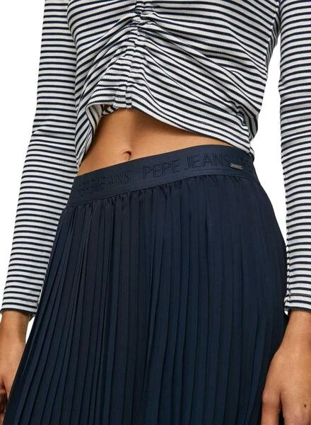 Jupe Pepe Jeans. Couleur marine. Plissé longueur midi. Tissu fluide. Ceinture élastique avec logo. Le mannequin porte une taille S.