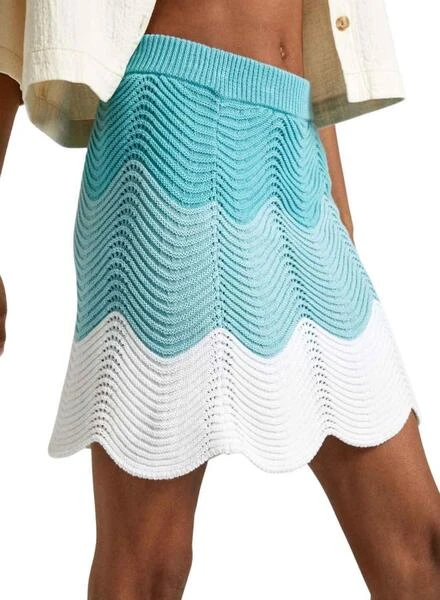 Jupe Pepe Jeans. Modèle Galea. Couleur bleue et blanche. Coupe mini. Taille haute. Tissu au crochet. Bas ondulé. Taille élastique.