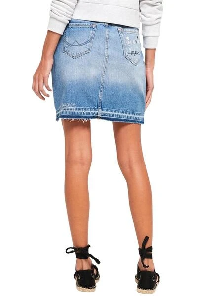 Jupe Superdry. Modèle Denim. Mini format. 5 poches. Lavage léger Impression amusante. Le mannequin porte une taille S.