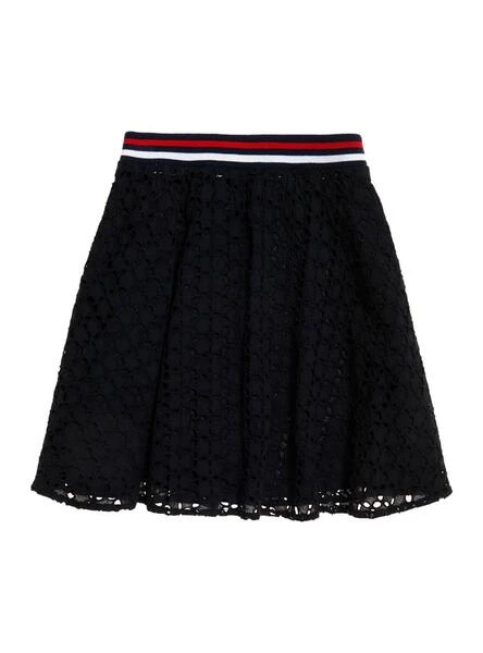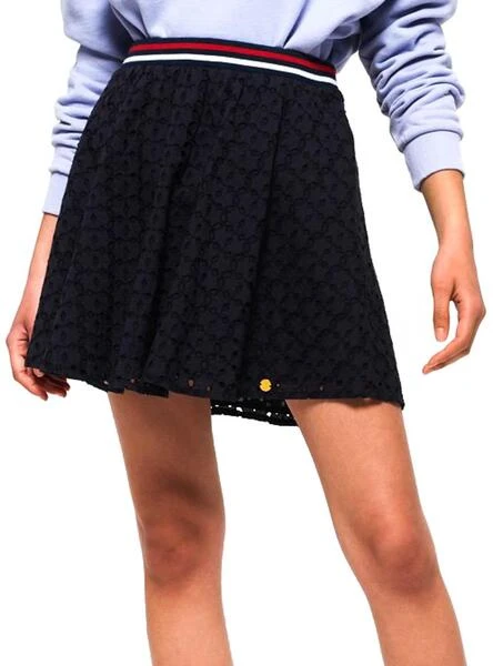 Jupe Superdry. Modèle Teagan. Couleur marine Taille en caoutchouc. Poches latérales Dentelle Listes à la taille. Badge métallique sur le devant.