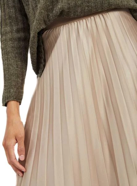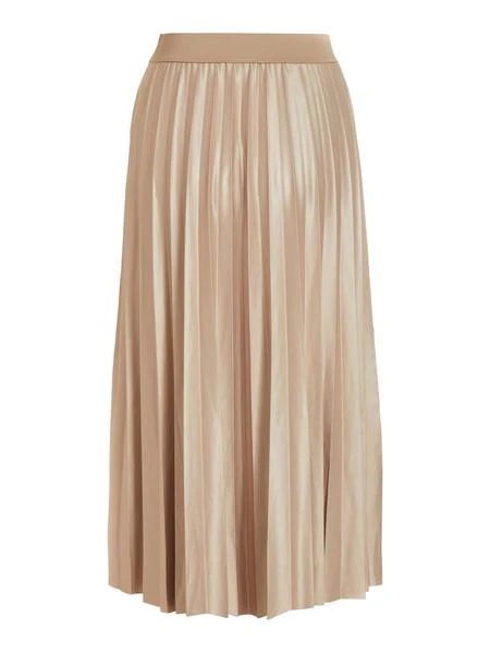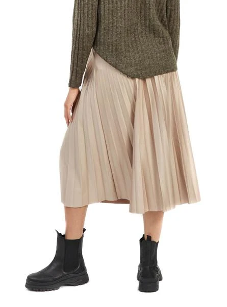 Jupe Vila. Modèle Nitban. Beige. Taille élastique. Plissé. Coupe midi. Le mannequin porte une taille 38.