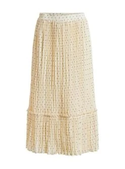 Jupe Vila. Modèle Vinilla. Couleur blanche. Imprimé à pois noirs. Taille elastique. Tissu plissé. Volantss en bas.