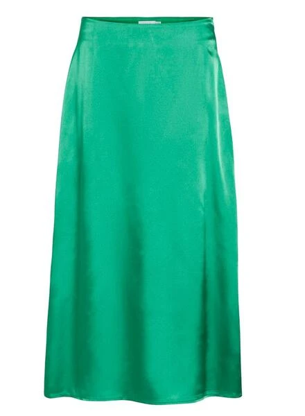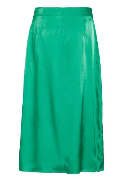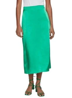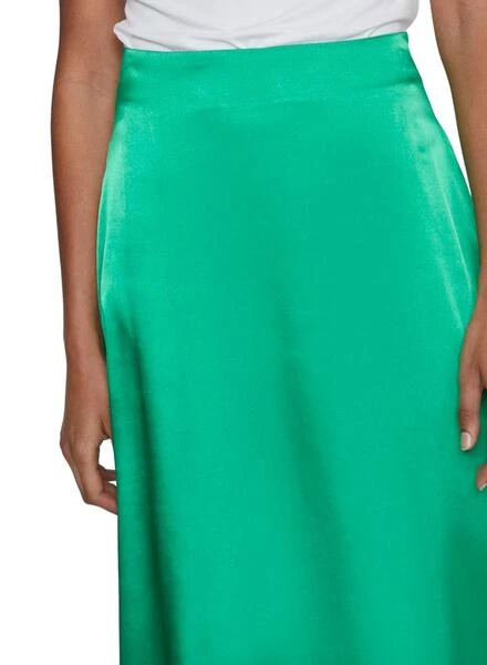 Jupe Vila. Couleur vert. Longueur midi. Fermeture à glissière latérale. tissu satiné Taille haute. Le mannequin porte une taille 36.