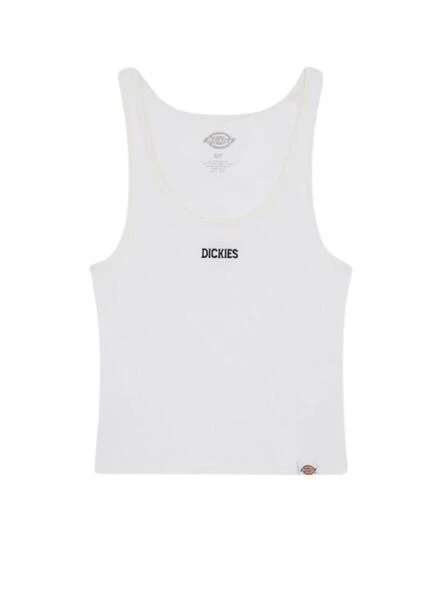 Maillot Dickies. Modèle Yorktown Vest. Couleur blanc. Col rond large. Tissu en coton côtelé extensible. Coupe ajustée flatteuse. Logo écrit. Coupe slim. Style crop. Le modèle porte la taille S.