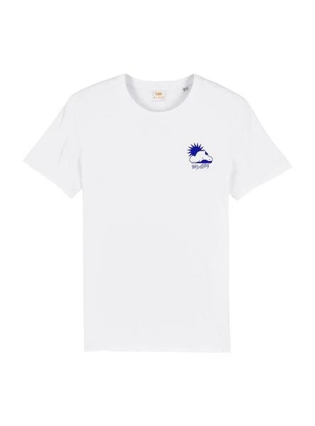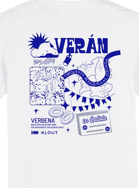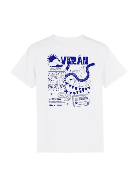 T-shirt Klout. Modèle Verbena. Couleur blanche. Col rond. Manches courtes. Coupe régulière. Fabriqué en coton biologique. Conçu et produit en Galice. Illustration de Verbena imprimée dans le dos en couleur bleue. Illustration pluie imprimée sur la poitrine.