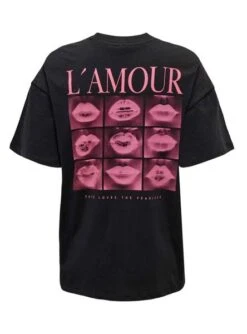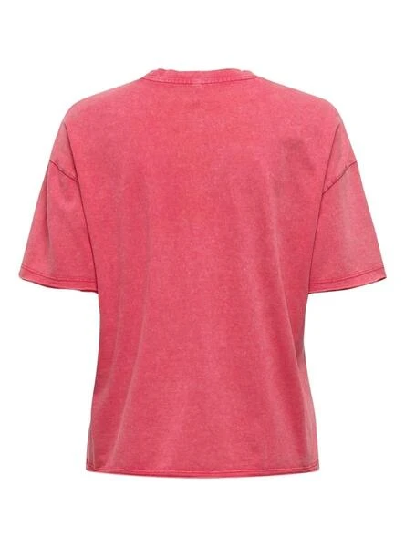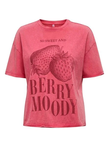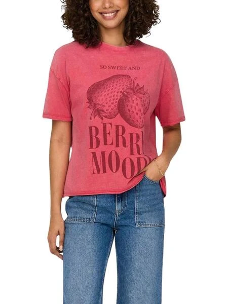 Débardeur Only. Modèle Kinna Fruit. Couleur rose fuchsia. Encolure ronde. Coupe ample. Manches courtes. Illustration de fraises imprimée sur le devant.