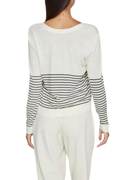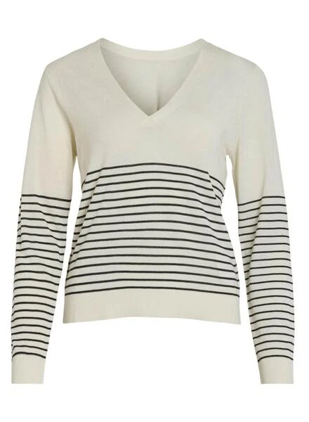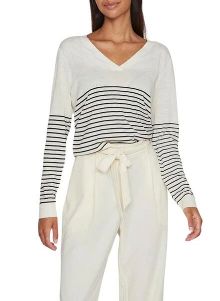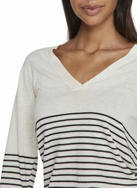 T-shirt Vila. Modèle Viabella V-Neck. Rayures imprimées. Couleur blanc et noir. Col en V. Manches longues. Épaules tombantes. Bords côtelés. Tissu en maille douce et extensible.