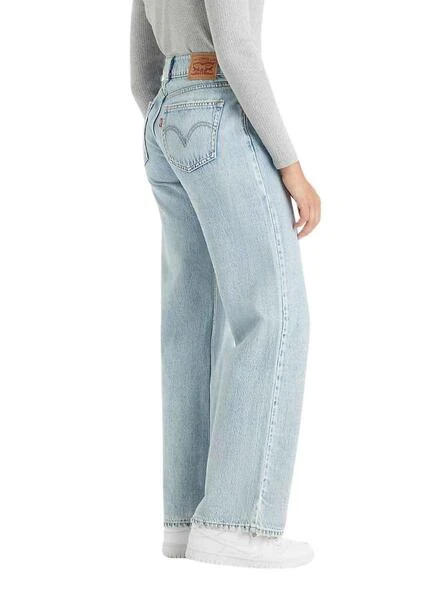 Pantalon Jeans Levis. Ample. low rise. Jambe droite. Lavage léger. Cinq poches. Taille large avec deux boutons. Le mannequin porte une taille 26.