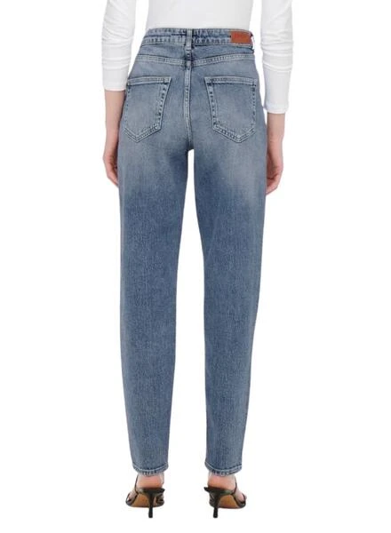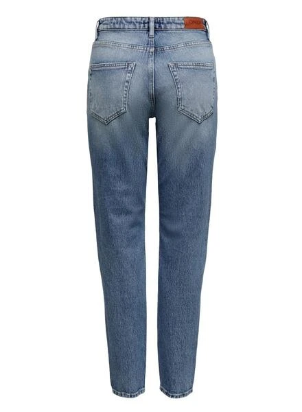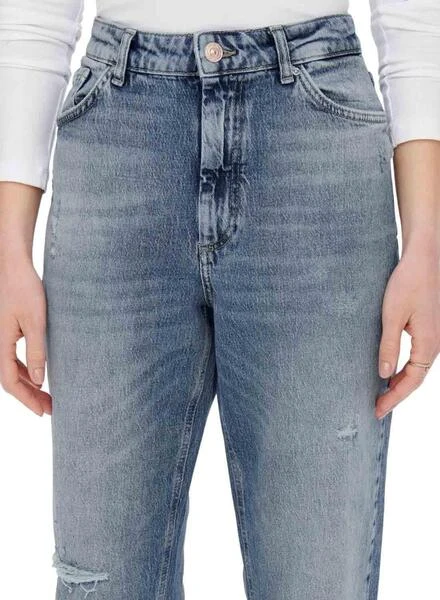 Pantalon Jeans Only. Maman en forme. High rise. Cinq poches. Détails décoratifs cassés. Le mannequin porte une taille S.
