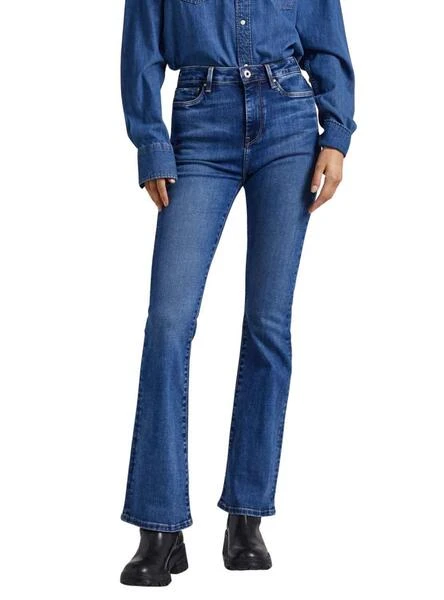 Pantalon Jeans Pepe Jeans. Modèle Dion. Jambe évasée. High rise. 5 poches. Effet usé. Délavé bleu moyen. Tissu denim powerflex super extensible. Fabriqué avec la technologie Wiser Wash. Détail de couture sur les poches arrière.