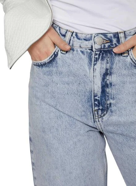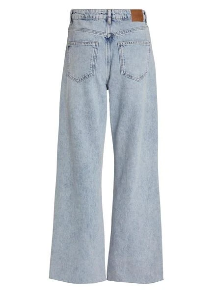 Pantalon jean Vila. Modèle Fiona. Couleur bleu clair. Fermeture boutonnée et zippée. Côté et arrière du Poche. Jean large. Taille ultra haute. Basse crue. Passants de ceinture pour. Le mannequin porte la taille 3832.