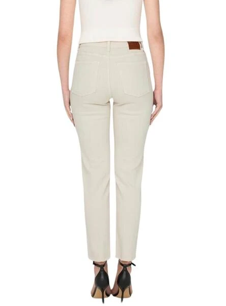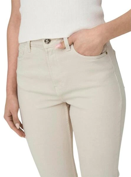 Pantalon Only. Modèle Emily. Couleur beige. Coupe droite. Fermeture à glissière et bouton. Poches avant et arrière. Longueur jusqu’aux chevilles.