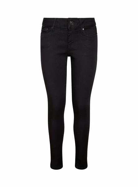 Pantalon Pepe Jeans. Modèle Pixie. Couleur noire. Fermeture bouton et zip. passants de ceinture. Skinny fit. mid rise. Cinq poches. Tissu denim extensible. Le mannequin mesure 1,75 cm et porte une taille 27.