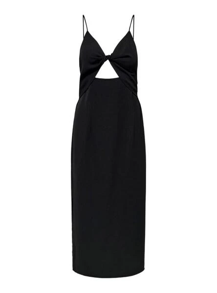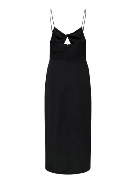Robe Only. Modèle Iris Thalia. Couleur noire. Coupe midi. Ouverture latérale. Fermeture à glissière arrière. Bretelles réglables. Encolure nouée. Découpe sous la poitrine.