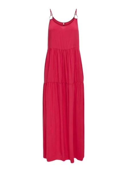 Robe Only. Modèle Sandie. Couleur framboise. Encolure en U. Sans manches. Bretelles avec pièce métallique. Coupe ample. Longueur maxi.