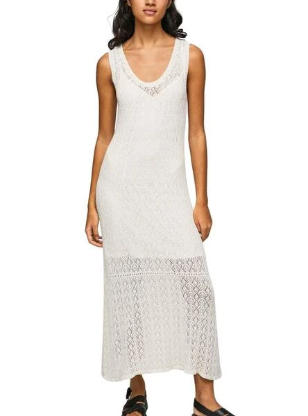 Robe longue Pepe Jeans. Modèle Fara. Couleur blanc. Emmanchure Manche. Col rond. Tissu fluide et ajouré. plaque de métal.