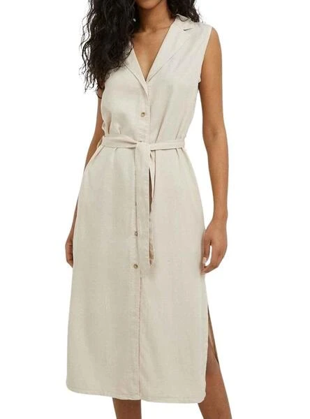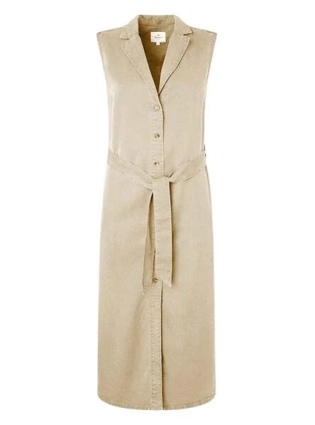 Robe Pepe Jeans. Modèle Maggie. Couleur beige. Sans manches. Col à revers avec encolure en V. Fermeture boutonnée. Ouvertures latérales. Avec ceinture.