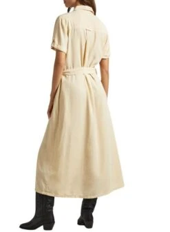 Robe Pepe Jeans. Tissu denim doux. Format midi. Coupe régulière. Manches sans manches. Col en V avec revers. Fermeture boutonnée sur le devant. Ceinture ajustable en denim. Passants à la taille. Poches latérales. Le mannequin porte la taille S.
