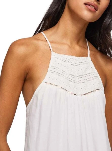 Robe Pepe Jeans. Modèle Pipra. Couleur blanc. Deux bretelles croisées au dos. Avec les volants. Détails brodés. Le mannequin porte une taille S.