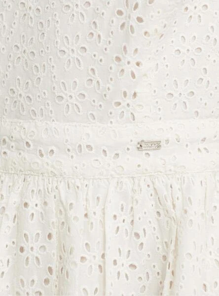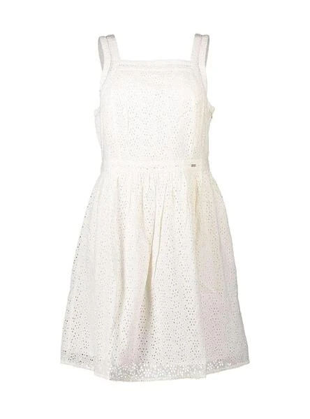 Robe Superdry. Modèle Blaire. Couleur blanche. Encolure carrée. Sans manches. Fermeture boutonnée au dos. Jupe avec vol. Tissu brodé.
