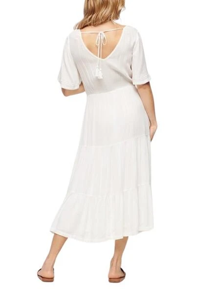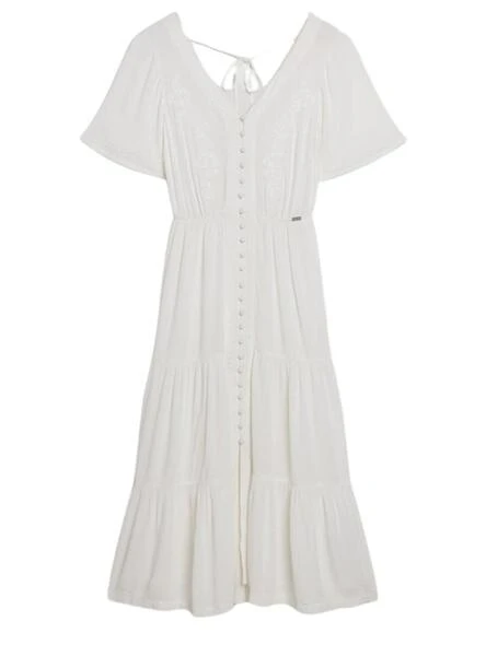 Robe Superdry. Modèle brodé. Couleur blanche. Encolure en V. Boutons avant. Manches courtes. Logo métallique à la taille. Coupe midi. Tissu léger.
