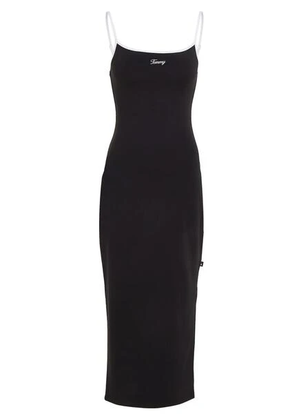 Robe Tommy Jeans. Modèle Tonal Script. Couleur noire avec des détails contrastés. Logo sur la poitrine. Avec bretelles. Ajusté au corps. Robe longue au-dessus des chevilles. Coupe latérale. Le modèle porte la taille S.