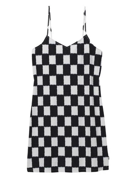 Robe Vans. Modèle Benton. Couleur noir et blanc. Tissu en tricot élastique froissé. Imprimé géométrique Checkerboard. Coupe mini. Encolure en V. Style slipdress. Bretelles fines.