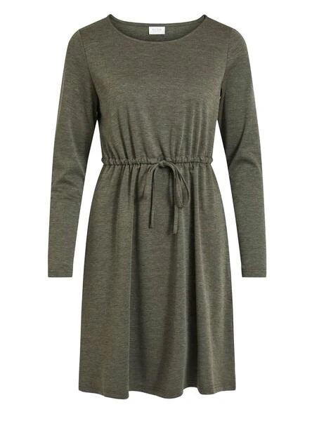 Robe Vila. Modèle Juner. Couleur verte. Manche longue. Col rond. Matière légère et élastique. Taille ajustable. Le mannequin porte une taille M.
