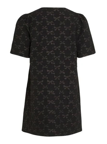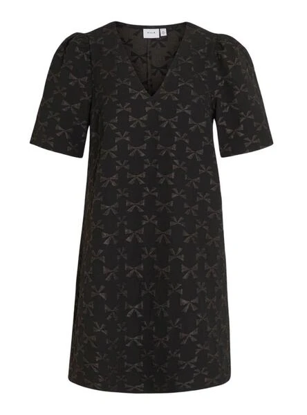 Robe Vila. Modèle Vianna. Couleur noire. Encolure en V. Manches courtes volumineuses. Mini-longueur. Tissu avec détails brodés en forme de nœud.