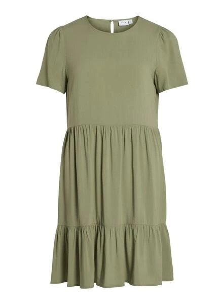 Robe Vila. Modèle Vipaya. Couleur verte. Col rond élastique. Manches courtes. Volants sur le bas. Tissu fluide. Fermeture avec bouton au cou. Le mannequin porte la taille S.
