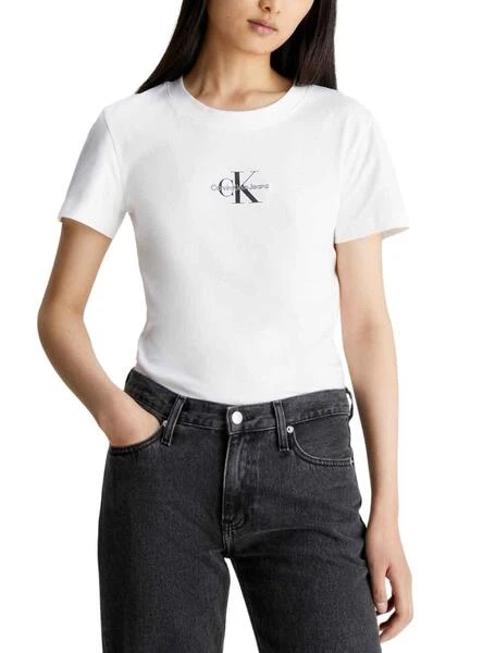 T-Shirt Calvin Klein Jeans. Modèle Jumpsuitlogo. Coupez le slim. Couleur blanc. Col rond. Logo brodé et imprimé sur la poitrine. Fabriqué en coton recyclé.