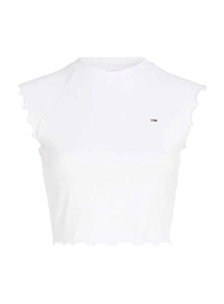 T-shirt Tommy Jeans. Modèle Lock. Couleur blanc. Volants sur les manches et l’ourlet. Drapeau de la marque brodé. Conception coupée.