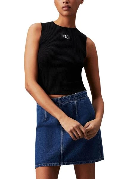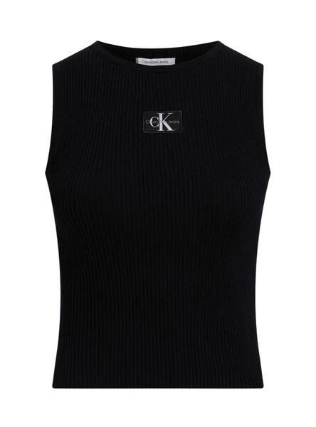 Top Calvin Klein Jeans. Couleur noire. Tricot côtelé doux. Coupe ajustée. Sans manches. Col rond. Insigne avec le monogramme de Calvin Klein sur la poitrine. Le mannequin porte la taille S.