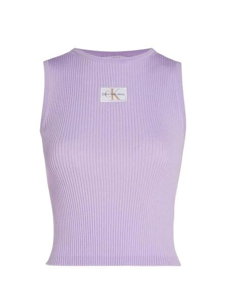 Haut Calvin Klein Jeans. Couleur lilas. Tricot côtelé doux. Coupe slim. Sans manches. Col rond. Monogramme Calvin Klein sur la poitrine. Le modèle porte la taille S.